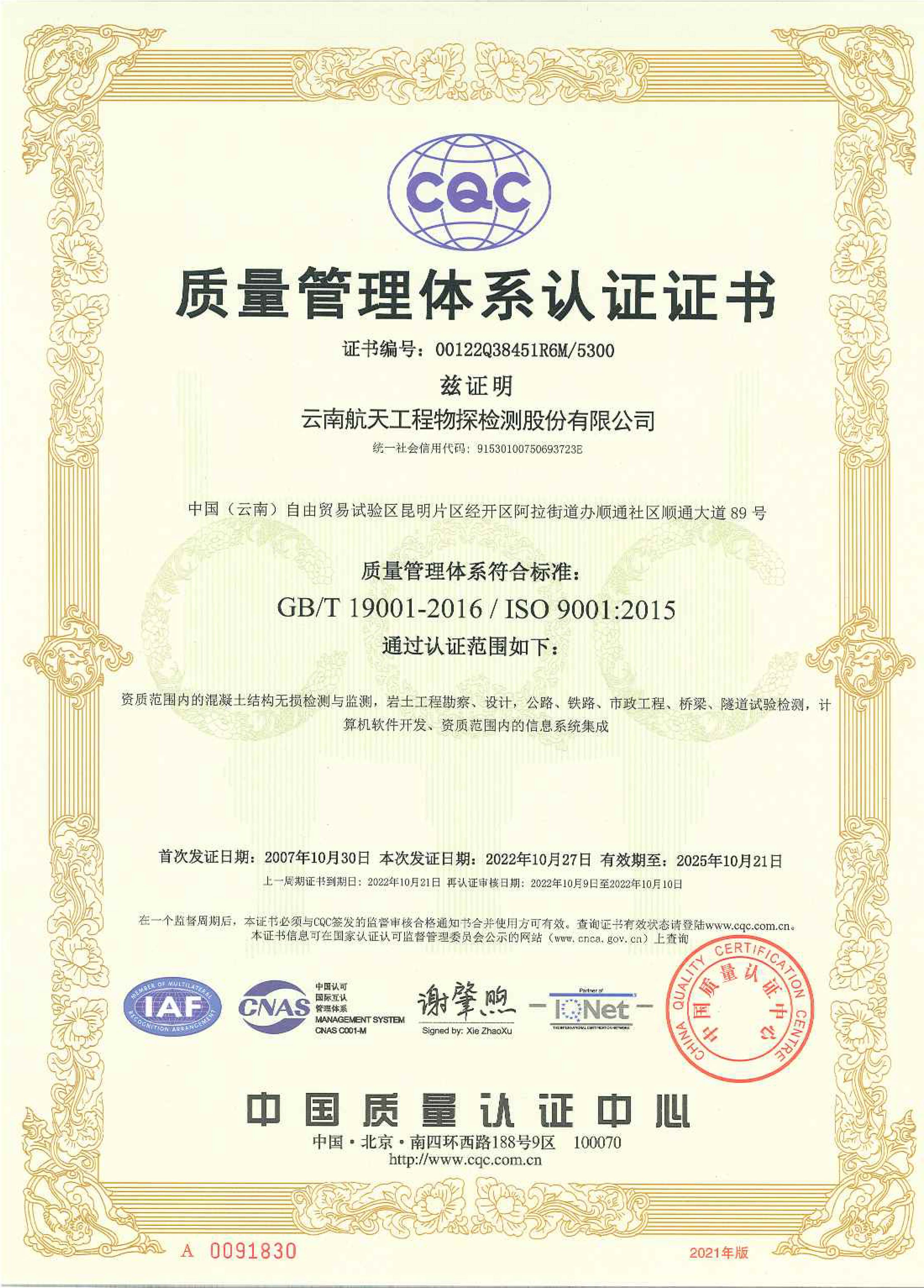 質量管理體系認證證書