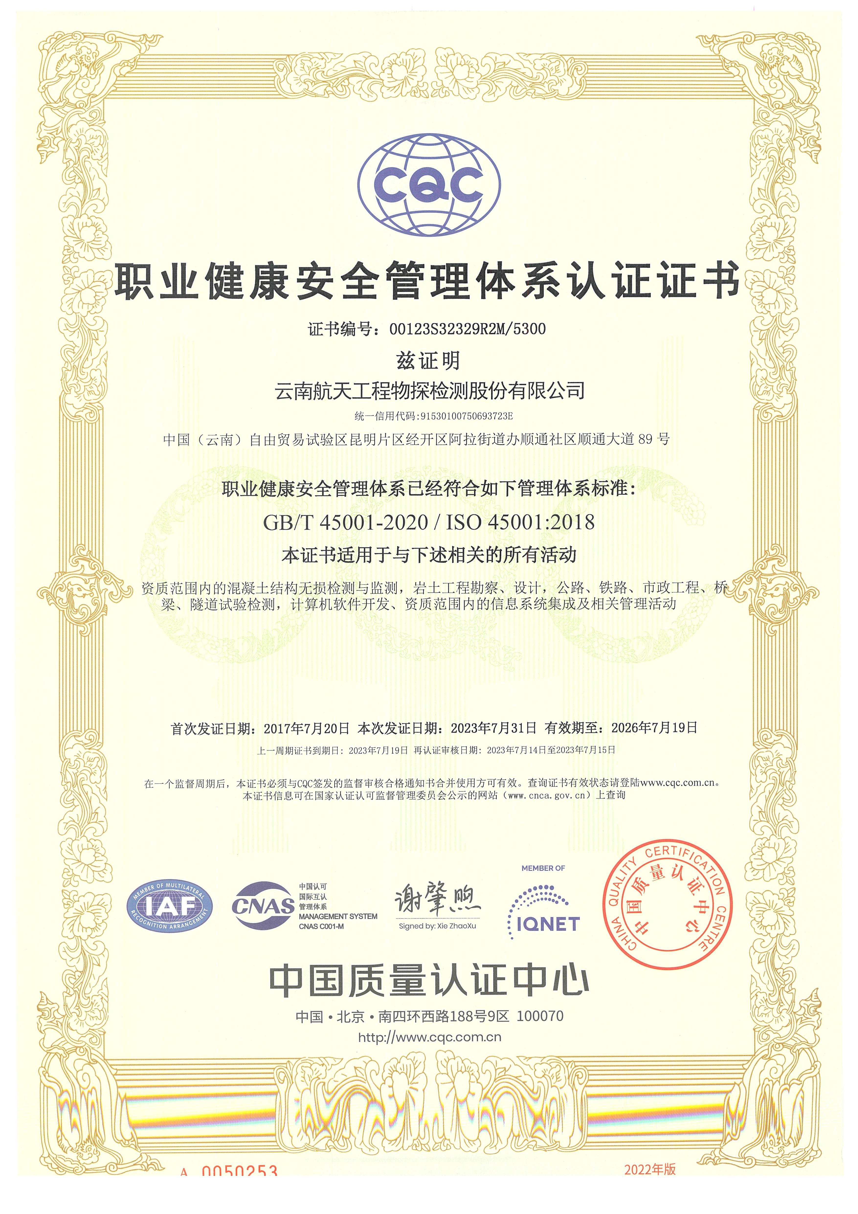 職業健康安全管理體系認證證書