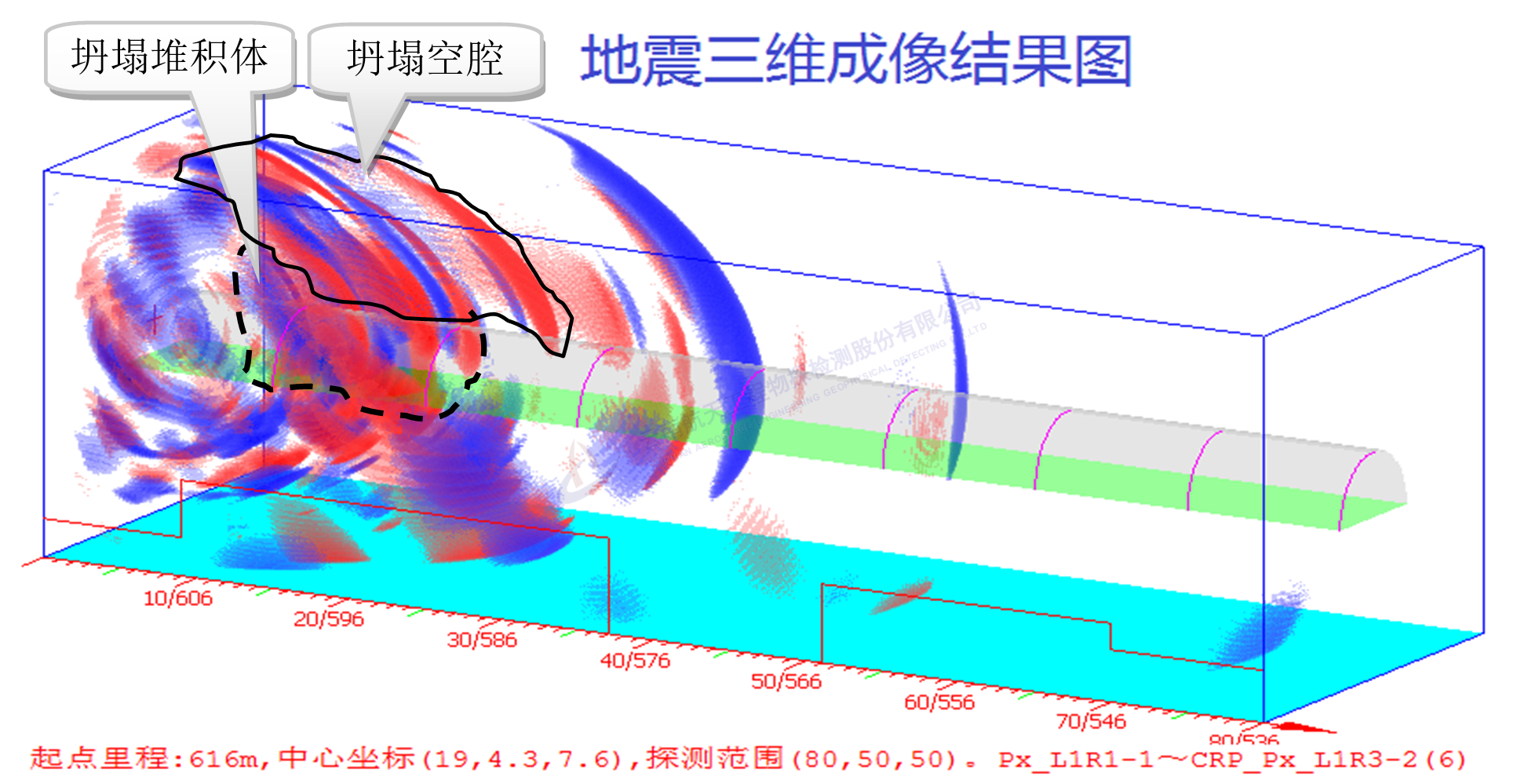 2017年9月,某在建高速公路隧道塌方,我公司利用綜合三維超前預報技術探明了洞內坍塌堆積體范圍、洞頂坍腔空間三維形態,為救災、處治提供了重要依據。